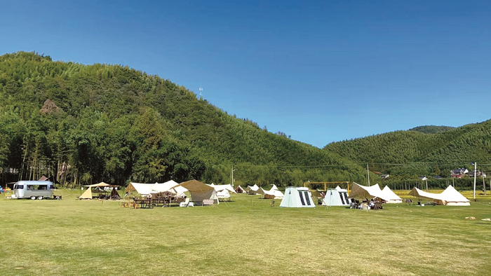 海宁大尖山滑翔基地也有一处小众露营地开始为周边不少城市的年轻人知悉,该营地一面靠山,一面临湖,面朝钱塘江,坐落于山谷。这段时间的营地,蓝天下一顶顶北欧风的白色帐篷,点缀着绿色大草坪,到了露营最美的季节。