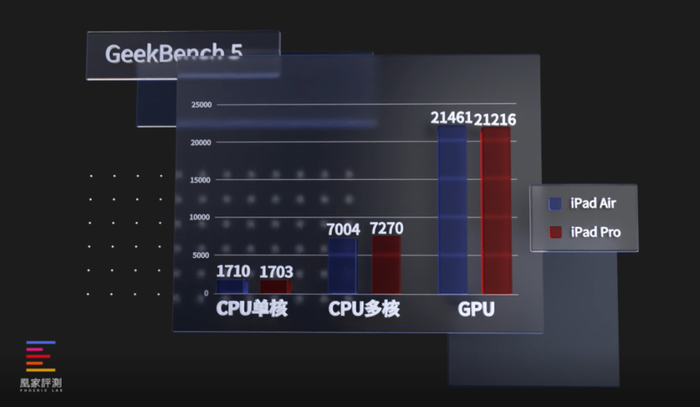 而我们拿到Air之后最关心的,就是想看看这颗M1,在性能释放上跟Pro那颗是否在同一水平。我们找来了搭载M1芯片的iPad Pro进行比较,先来看跑分,在Geekbench5中,iPad Air多核成绩1710,多核成绩7004,GPU得分21461,与iPad Pro整体相差不大,性能输出在同一水平,多核成绩iPad Pro略高。