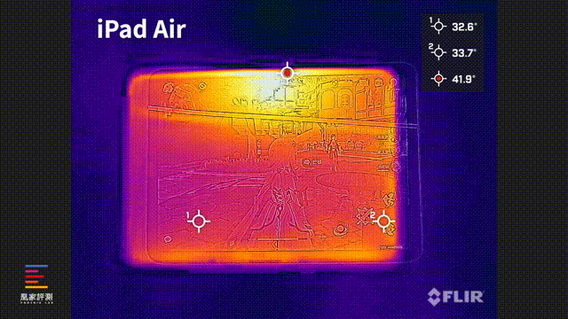 同时我们也用红外测温仪记录温度,游戏之后iPad Air正面最高温度41.9°,背面最高温度43.7°;iPad Pro正面最高温度39.6°,背面最高温度41°,发热也处于同一水平。