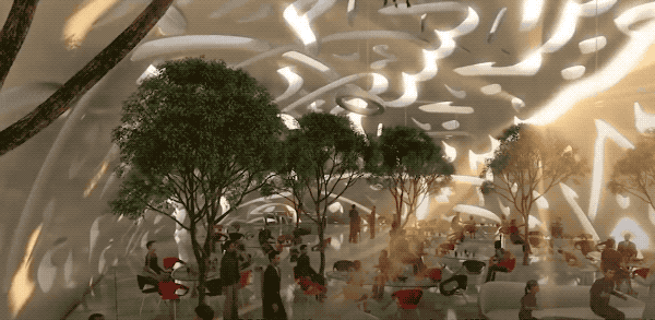 博物馆内部共有七层,参观者可通过两座外部桥梁进入。为了切合“未来”的主题,内部设计也是结合了流动的点、线、面,营造出了许多奇特的造型,赋予了浓烈的科幻色彩。阿拉伯书法图案从外延伸至内,在四周的墙壁上若隐若现。