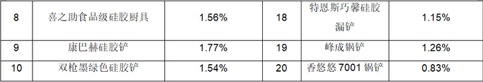 此外,还有9款硅胶铲的挥发性有机化合物含量超过了1%,但在1.5%以下;仅有3款硅胶铲低于1%,分别为: