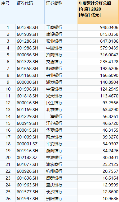 数据显示,2020年度上市银行中江阴银行、青岛银行、齐鲁银行、招商银行等16家银行分红比例均高于30%。分红金额方面,工商银行、建设银行、农业银行、中国银行均超过500亿元,招商银行、交通银行、邮储银行、兴业银行的分红金额也均超过150亿元。