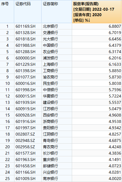 如此来看,以3月17日收盘价计算,当前北京银行股息率最高,逼近6.9%,交通银行、光大银行、中国银行、农业银行、浦发银行、上海银行股息率也均高于6%。