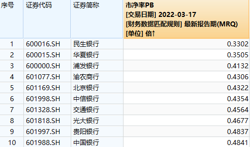 35只银行股股价已经跌破净值,10只个股市净率更是不足0.5倍,包括渝农商行、北京银行、贵阳银行3家城农商行,还包括民生银行、华夏银行、浦发银行等5家股份行,以及中国银行、交通银行2家国有行。