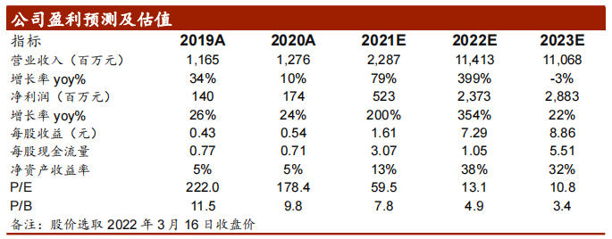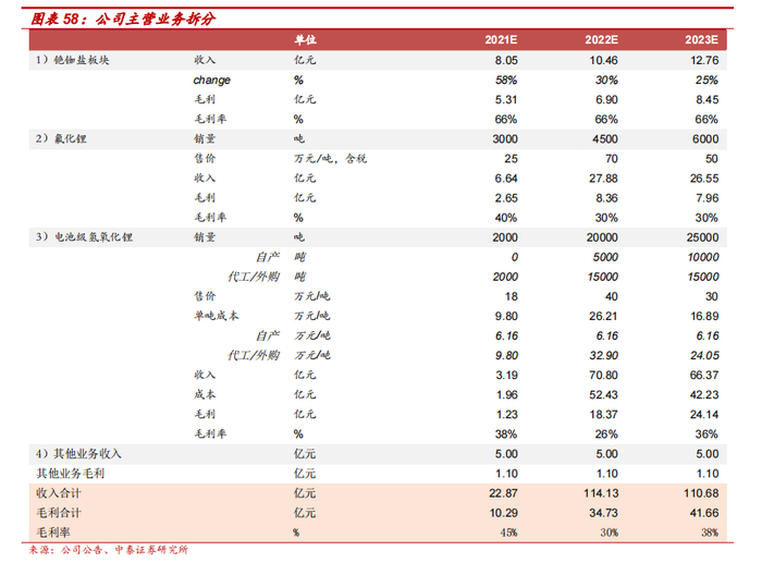 基本假设:1)量:21年底公司氟化锂产能由3000→6000吨,假设21-23年氟化锂销量分别为3000、4500、6000吨;21年8月,公司2.5万吨锂盐项目建成,目前已经达产,假设21-23年电池级氢氧化锂销量分别为2000、20000、25000吨;2)价:2020年6月-22年2月,氟化锂价格已经由11万/吨上涨至65万/吨以上,假设21-23年氟化锂平均售价分别为25、70、50万元/吨;国内现货氢氧化锂价格已经上涨至40万/吨以上,基于我们对供需结构的判断,假设电池级氢氧化锂平均售价分别为18、40、30万元/吨。3)毛利率:历史上看铯铷板块毛利率维持稳定,假设22-23年铯铷板块(铯铷盐&甲酸铯)毛利率维持在66%;氟化锂历史上看毛利率水平在30-40%区间波动,假设22-23年氟化锂业务毛利率维持在30%左右。