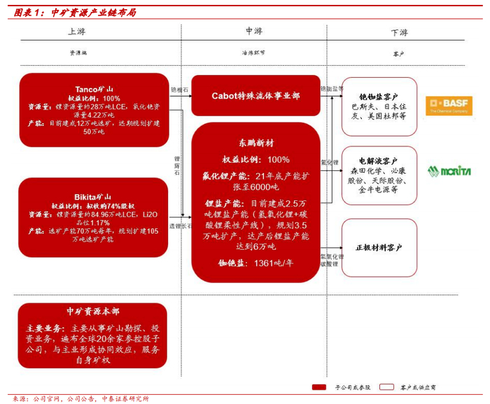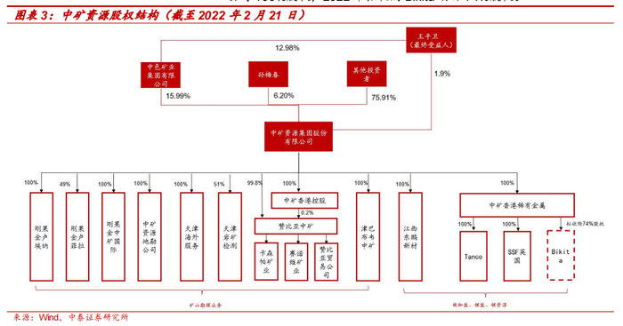 截至2022年2月21日,中色矿业集团有限公司持股15.99%,为公司第一大股东。王平卫先生持有中色矿业12.98%股份和中矿资源1.9%股份,为公司最终受益人。公司主要子公司包括江西东鹏新材,主要负责铯铷盐、氟化锂、碳酸锂、氢氧化锂等稀有金属新材料的生产;子公司中矿香港稀有金属为公司海外资源布局的平台型公司,持有Tanco公司100%股权,2022年拟收购Bikita项目74%股权。