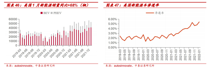 美国电动车政策拟加码,美国市场新能源车销量有望超预期。2022年1月美国电动车销量为53522辆,环比-6.25%,同比68.45%,电动化渗透率为5.4%。2021年5月26日,参议院财政委员会通过了《美国清洁能源法案》提案:提高现行7500美元/车的税收抵免上限,单车抵免上限提升至1.25万美元。