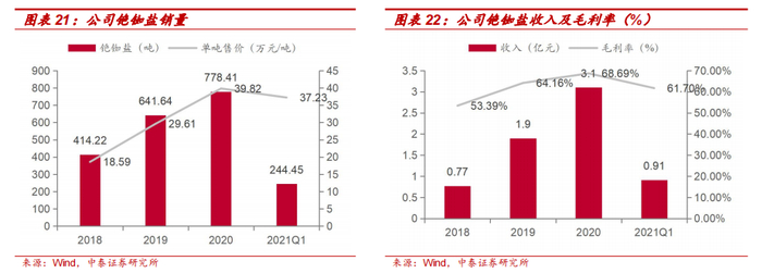 截至2019年,公司甲酸铯产能约4200bbl,公司在深圳盐田港保税区储存了7862桶(bbl)、密度2.3 g/cm³的甲酸铯产品,为国内业务提前布局。21Q1甲酸铯业务贡献收入0.88亿元,毛利率为74.24%。
