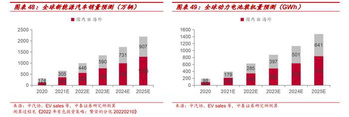 全球新能源车将延续高增长趋势。1)新能源车销量预测:全球电动车市场驱动动力转向“内生增长”模式,国内《新能源汽车产业发展规划(2021-2035年)》提出2025年新能源汽车渗透率将达到20%,全球电动车产业链迎来高速增长期,我们预计2021-2025年新能源车销量分别为657/999/1353/1721/2192万辆,2021-2025CAGR为35%,2025年全球新能源汽车渗透率约为20%左右。2)动力电池装机预测:21-25年动力电池装机分别为393、629、877、1131、1476GWh。