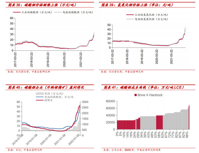 受益于终端新能源汽车需求爆发,供需错配驱动锂盐价格创历史新高。2020年7月-2022年3月,电池级碳酸锂价格由3.95→51.75万元/吨,电池级氢氧化锂价格由3.95→48.49万元/吨,锂精矿价格由390→2700美元/吨以上,企业利润也是水涨船高。