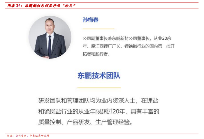 技术积淀深厚,延伸至碳酸锂/氢氧化锂领域。子公司东鹏新材深耕锂盐领域20载,产品质量达到行业领先水平,其董事长孙梅春,曾任江西锂盐厂厂长,从业20余年,是国内第一批锂盐从业者,技术沉淀深厚。公司于2018年开始规划2.5万吨微粉级锂盐产线(氢氧化锂、碳酸锂柔性产线),产线于2021年8月建成投产,2022年计划扩建3.5万吨锂盐项目,达产后总产能将达到6万吨,进一步打开公司成长天花板。