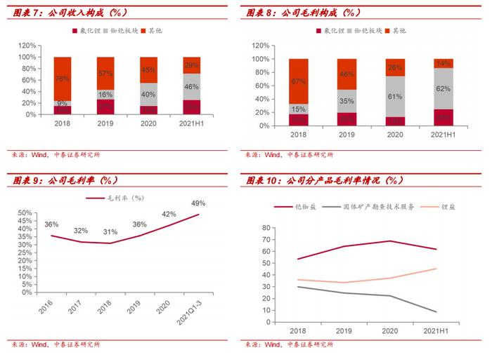 锂盐成为公司第二增长曲线。近年来,公司不断加码稀有轻金属业务布局,铯铷盐稳定增长,锂盐业务打开公司成长天花板。自2018年收购东鹏新材以来,公司稀有轻金属业务收入和盈利能力持续增长,逐步成为公司主营业务,铯铷盐业务营收从2018年0.77亿元增至2021H1的4.03亿元,锂盐业务从2018年1.27亿元增至2021H1的2.21亿元,两者营收占比总计超70%,毛利占比接近90%。