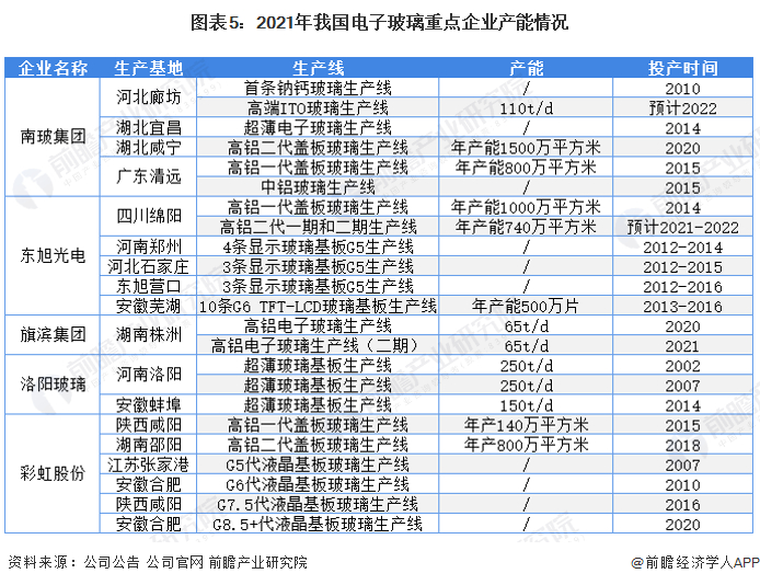 由于电子玻璃行业的进入门槛较高,拥有较高的技术壁垒和资金壁垒,因此行业的参与者较少。同时技术的研发、产线的建设周期较长,我国目前拥有电子玻璃产线的企业相对较少。通过对相关企业的盖板玻璃原片、显示玻璃基板的生产线进行统计,目前我国主要的电子玻璃供应企业包括南玻集团、东旭光电、旗滨集团、洛阳玻璃、彩虹股份等。