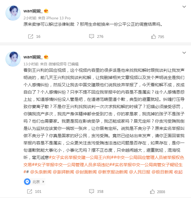 据潇湘晨报,2月19日,微博用户“wan婉婉_”发布视频,视频中,一名女子手持身份证,声称要举报中交一公局集团有限公司总经济师王兴利,隐瞒已婚事实,与自己同居一年多,并致其流产并患上抑郁症。