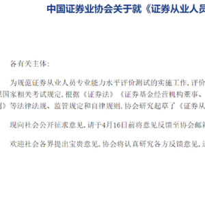3月17日晚,中国证券业协会就《证券从业人员专业能力水平评价测试实施细则(征求意见稿)》向社会公开征求意见,其中明确将证券从业资格考试调整为非准入型的专业能力水平评价测试。