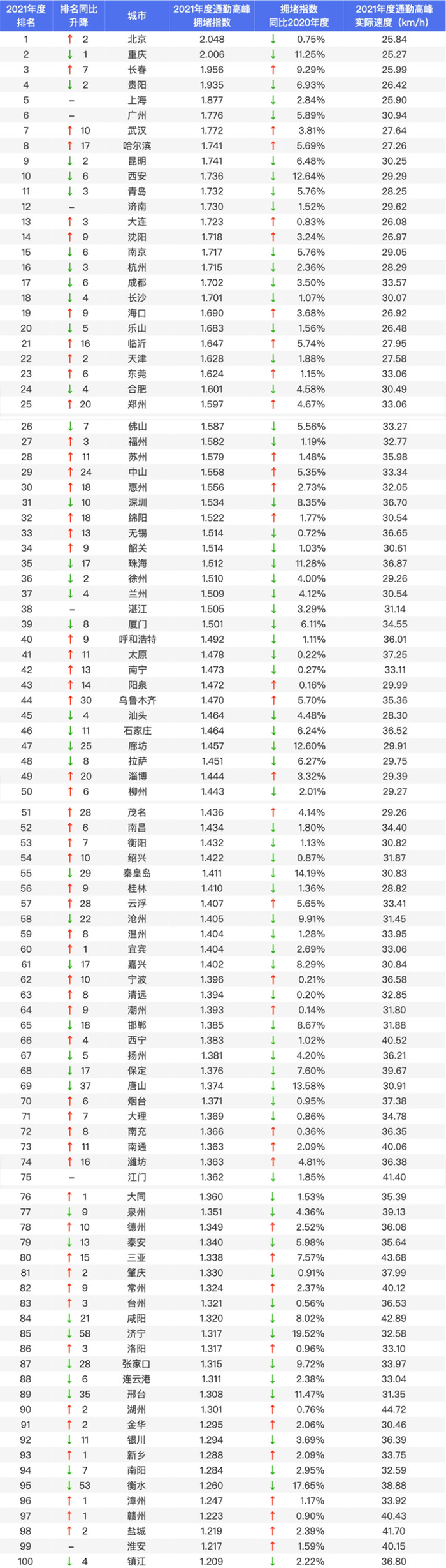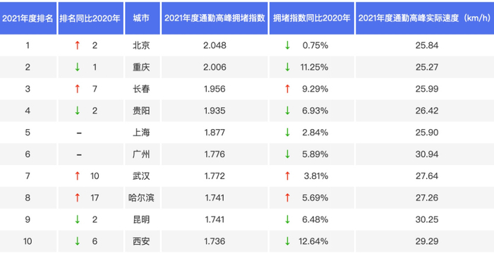 在2021年百城通勤高峰交通拥堵榜单中,北京、重庆、长春位列拥堵榜单前三,高峰期实际通行速度不足26km/h;紧随其后依次是贵阳、上海、广州、武汉、哈尔滨、昆明、西安(全国百城拥堵榜附文末)。