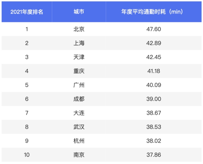 通勤时耗也是衡量各大城市交通效率的重要指标。在百城通勤时耗排名中,前十名城市依次为北京、上海、天津、重庆、广州、成都、大连、武汉、杭州、南京。其中,北京的年度平均通勤时耗达到47.6分钟,分别为上海的1.11倍、南京的1.26倍。