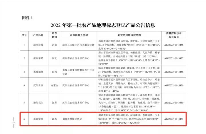 近日,国家农业农村部公布了2022年第一批农产品地理标志登记产品,全国共56个产品入选,如皋市“新官紫桃”入选。这是如皋继“如皋黄鸡”“下原蘘荷”之后第三个农产品地理标志登记产品。
