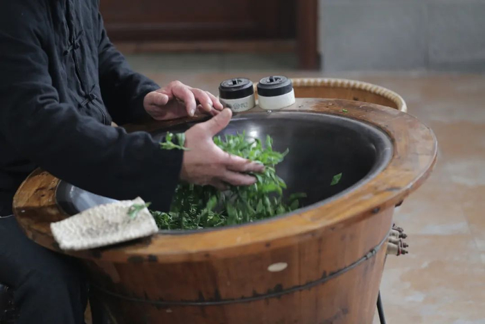 有句老话:“茶不离锅,手不离茶。”即通过200℃高温手工炒茶,将鲜叶中的水分蒸发,谓之杀青,为绿茶的初制工序之一。