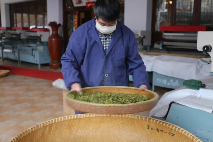 中午将采完的新鲜茶叶放入晾筛中摊放,通常要放6~7小时, 让其自然萎凋。