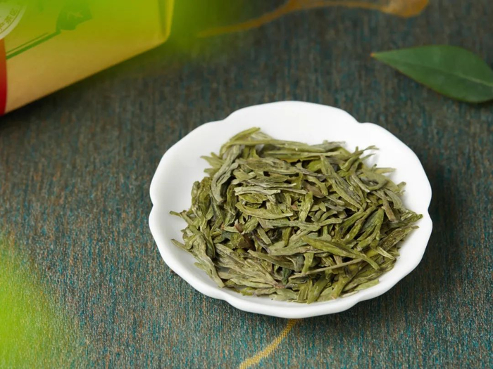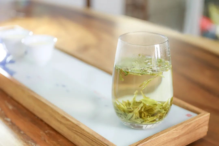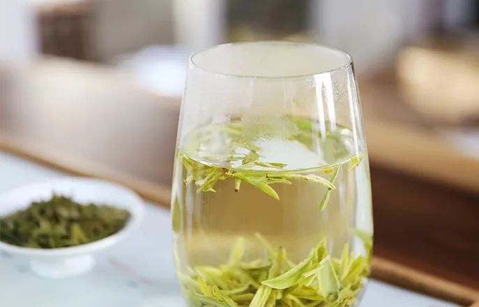 狮峰龙井 ,色泽绿润,宜用瓷器或玻璃杯泡茶,加以85℃水冲泡,3g约150mL的比例。