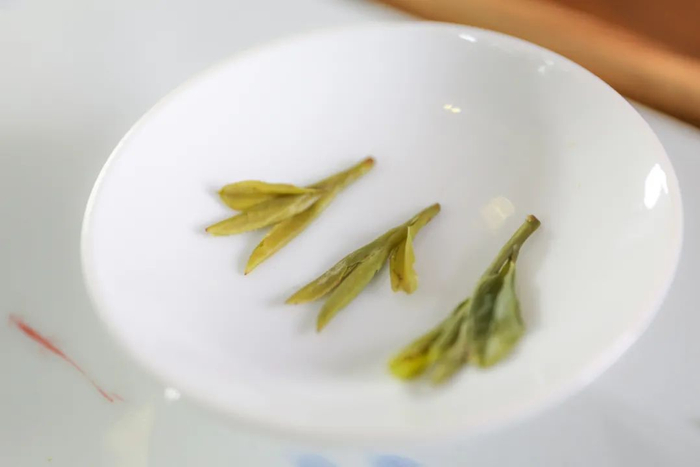 叶底柔软透亮,每根芽头鲜活饱满,型如松针,手捏可觉弹性。