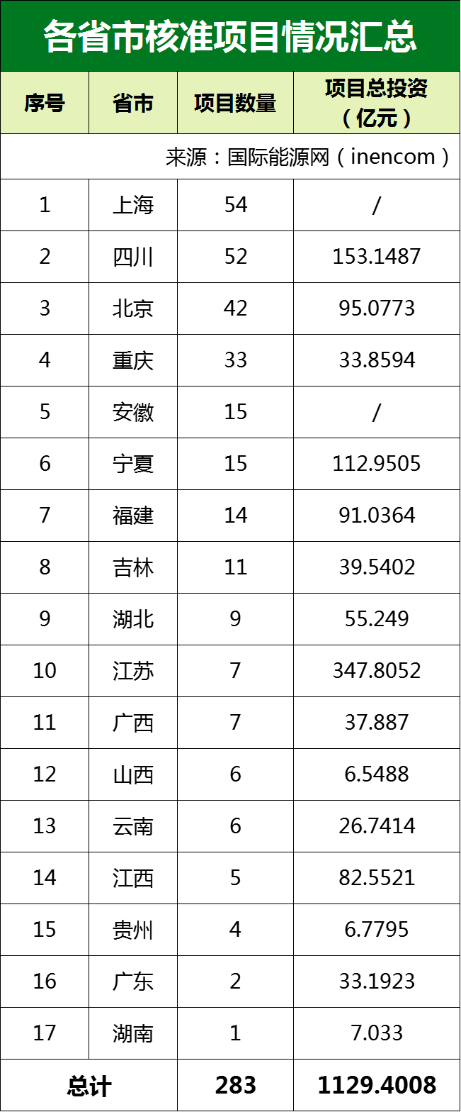 2021年作为“十四五”开局之年,电力项目核准情况也变得十分慎重。据国际能源网(微信号:inencom)不完全统计,2021年起至今,北京、上海、广东、重庆、江苏、安徽等17省市共核准电力项目283个,项目总投资超1129亿元。建设单位涉及国家电网、南方电网、华电国际等多家大型上市企业。