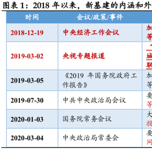 1)2018年12月中央经济工作会议首次提出“新基建”的概念。2018年中央经济工作会议着重强调“加快5G商用步伐,加强人工智能、工业互联网、物联网等新型基础设施建设”,这是“新基建”这一概念首次出现在中央层面的会议之中。5G、人工智能、工业互联网、物联网等领域被明确纳入新基建范畴。