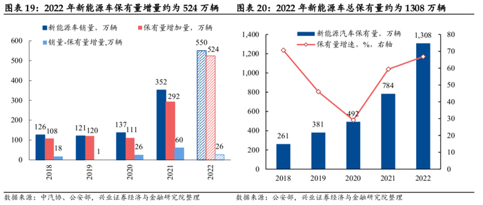 2022年新能源车保有量约为1308万辆。首先,我们计算2018-2021年新能源车销量(中汽协数据)和保有量增量(公安部数据)之差的平均值,结果约为26万辆/年,其概念类似于年均报废车辆数量。然后,中汽协预测2022年新能源车销量为500万辆,乘联会预测为600万辆。我们取二者平均值,并减去上文所得年均报废车辆数量,可得2022年新能源车保有量增量约为524万辆,总保有量约为1308万辆,同比增速约为66.84%。