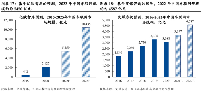 2022年车联网行业规模约5018亿元。根据亿欧智库在《2021中国车联网行业发展趋势研究报告》中的测算,2020年中国车联网行业规模约为2127亿元,预计2025年中国车联网市场规模将超过1万亿元。以此为依据,若假设中国车联网市场规模每年增量相同,则2022年中国车联网市场规模约为5450亿元。此外,根据艾媒咨询的测算,2022年中国车联网市场规模约为4587亿元。二者之间的测算数据差距较小,说明各机构针对车联网市场规模的估测相对稳健。本文采用二者之间的平均值5018亿元作为2022年中国车联网市场规模的一致预期进行测算。