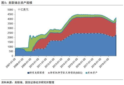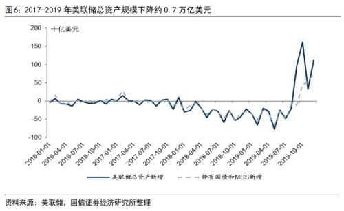 ■三是缩表阶段,美联储总资产下降了约0.70万亿美元。美联储2015年底首次加息约两年后才开始缩表,美联储于2017年6月公布缩表方案,缩表的主要方法是逐渐减少对到期债券的再投资:初始每月减少国债60亿美元、MBS40亿美元的再投资;随后每隔3个月再追加减少国债60亿美元,MBS40亿美元,直至减少量达到国债300亿美元,MBS200亿美元的上限。美联储于2017年10月正式启动缩表,2019年8月停止缩表,比预定的锁表方案提前了两个月,主要是为了2019年8月的降息。2019年8月末美联储总资产规模降到3.76万亿美元,较2017年10月末下降了0.70万亿美元。其中,2019年8月末美联储持有国债和MBS分别是2.10万亿美元和1.49万亿美元,较2017年10月末分别下降了0.37万亿美元和0.28万亿美元。