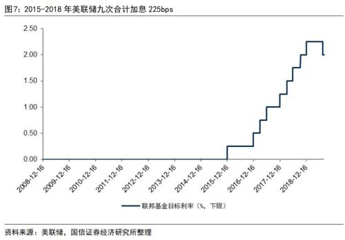 ■二是加息阶段,累计九次加息,利率上调225bps。美联储于2015年12月首次加息,到2018年底合计加息九次,联邦基金利率目标区间由0.00%-0.25%升至2.25%-2.50%。美联储taper结束一年之后才正式启动加息,给予市场充分的预期和反应时间。2019年8月美联储进入降息周期。