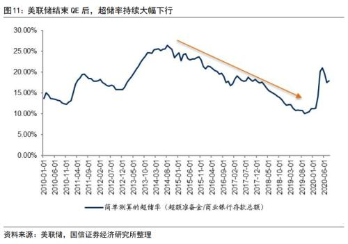 我们根据美联储披露的超额准备金规模以及商业银行存款总额计算超储率(超额准备金/存款总额),次贷危机以来美联储扩表期间超储率持续上行,最高达到2014年三季度的26%,扩表结束后超储率持续下行,2017年10月启动缩表后超储率下行态势加剧,降到2019年9月末的10%。超储率的持续下降制约了商业银行信用扩张,使得商业银行总资产增速在2016-2019年持续下行。