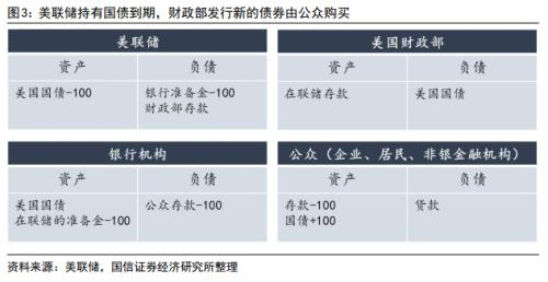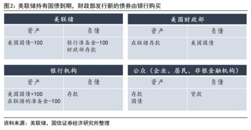情况二:如果美联储持有的100美元国债到期,财政部发行100美元新的债券,财政部国债余额不变。如果发行的国债由银行购买持有,各机构资产负债表变化如图2,美联储资产端“美国国债”科目减少100美元,负债端“银行准备金”减少100美元;银行资产端“美国国债”增加100美元,但“在联储的准备金”减少100美元;财政部和公众资产负债表不变。该情况下银行资产负债总规模不变,但准备金减少100美元替换成100美元的美国国债,准备金减少带来银行信用派生能力下降。