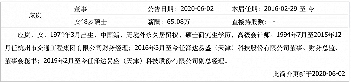 应岚1974年出生,1994年7月至2015年12月任杭州市交通工程集团有限公司财务经理;2016年3月至今任泽达易盛(天津)科技股份有限公司董事、财务总监、董事会秘书;2019年2月至今任泽达易盛(天津)科技股份有限公司副总经理。
