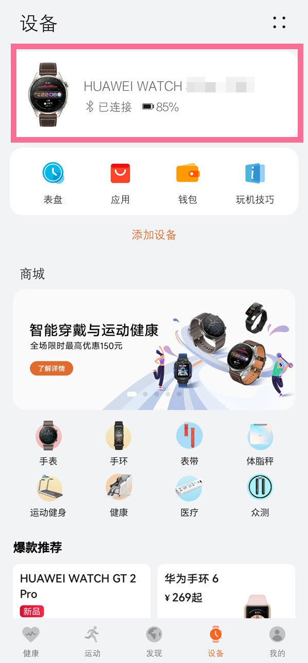 1、打开华为运动健康APP,在“设备”界面点击绑定的设备,进入手表详情页。