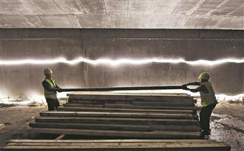 ↑3月16日,工人在湖北武汉市武昌滨江核心区地下空间环路工程工地施工。图据工人日报