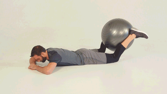 动作要领:身体趴下,双手交叉放置在眼前,肘部伸出在身体两侧。用小腿和脚踝夹住瑜伽球,小腿弯曲90度。绷紧腿部将球向上垂直举起,大腿离开地面几英寸,明显感受到刺激大腿后侧肌群和臀肌,降低抬起速度并多次反复。