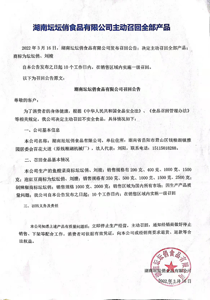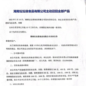 湖南坛坛俏食品有限公司主动召回全部产品