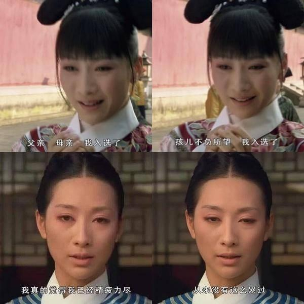 是什么在维持《甄嬛传》的生命力?是乐此不疲造梗的网友。作为一部完结多年的作品,这部剧如今所有的再现都基于网友的二次解读和二次创作,其中不仅包括对剧情的讨论和人物分析,而且包含着台词、场景的迁移与挪用。举个例子,安陵容在入选进宫时,场景为表情兴奋且自言自语“父亲母亲我入选了”,安陵容即将被打入冷宫前,场景为面无表情自言自语“我真的觉得我已经筋疲力尽”,这两个场景被单独拎出来组成对比,通过网友的二次解读,完全脱离了安陵容这个人物角色的命运悲欢,而变成了“考上研究生时的我和写毕业论文的我”,从而实现了对这一场景的挪用,也由此形成了一个与观众现实生活无缝衔接的“梗”。