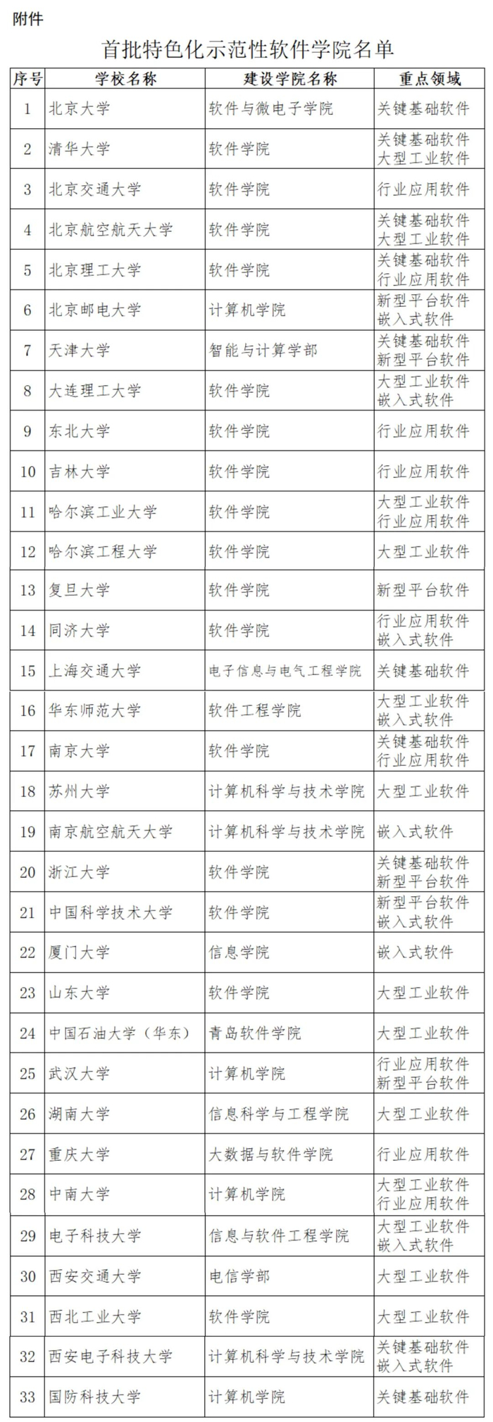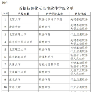 教育部办公厅、工业和信息化部办公厅正式印发《教育部办公厅 工业和信息化部办公厅关于公布首批特色化示范性软件学院名单的通知》(以下简称《通知》),明确了首批特色化示范性软件学院(33家特色化示范性软件学院及68家合作企业名单附后)。