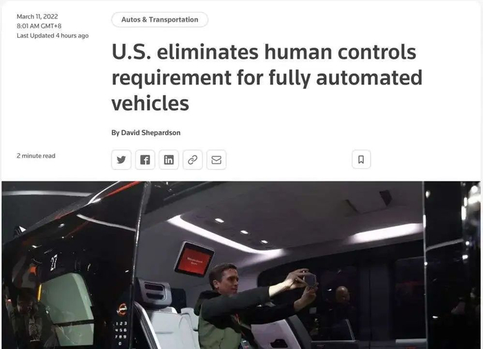 而3月11日,路透社报道,美国通过法规,自动驾驶汽车将不再必须配备手动控制装置。
