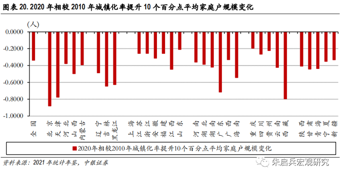 近十年我国城镇化率与平均家庭户规模变化呈反向关系。2000年之后,我国城镇化进度明显加快,从2010年到2020年,城镇化率提升迎来最快速度,上升13.9个百分点达到63.9%。在城镇化率提升的过程中,我国平均家庭户规模则出现明显下降。从全国来看,2010年到2020年十年间,城镇化率每提升10个百分点,平均家庭户规模下降0.3378人。但从不同地区来看,城镇化率提升对家庭户规模的影响差异较大:下降幅度最大的地区如北京、西藏、天津、广东,城镇化率每提升10个百分点分别对应家庭户规模减小0.8805人、0.7963人、0.7767人和0.7152人。