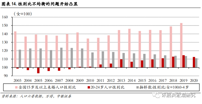 从低龄人口性别比变化情况看,择偶性别不均衡的问题仍将持续。从全国范围内15岁及以上未婚人口性别比变化来看,2010年之前基本维持在140下方波动,但2011年之后则出现持续上行趋势;20-24岁人口性别比上升的趋势与此一致,2003年-2009年之间维持在100下方,当时造成社会广泛关注的“剩女”现象,但2010年之后则持续上升,2019年达到2003年以来的最高点114.6。性别比不均衡的情况短时间内难以解决,从0-4岁人口性别比看,均衡水平应该在104-107之间,但2003年以来,我国新生儿性别比一直在110以上,因此性别比不均衡的问题预计在未来一段时间内仍将持续,对20-24岁人口的婚育持续构成影响。