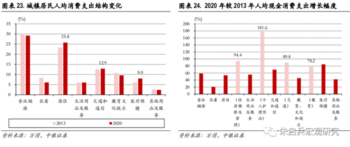 2020年与2013年相比,消费支出中与生育相关的消费支出增速更快。比较2020年较2013年全国居民人均现金消费的大类和细分类增速来看,大类当中增速最高的是医疗保健87.4%,其次是交通通信69.8%,食品烟酒、生活用品和服务、以及居住的消费增速相当,分别为58.7%、55.4%和53.6%。但是在细分类当中,个人护理用品增速最高,达到181.6%,其次是住房维修及管理94.4%、交通89.8%和教育78.2%,其中较多都与生育相关,如改善型消费需求的住和行,以及必须消费的日用品和教育。