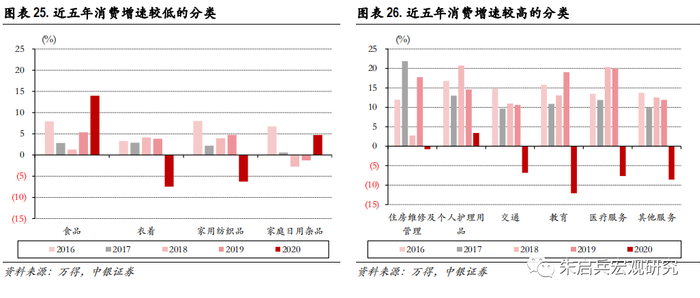 最近五年消费增速高低的品类比较:服务型消费需求更强。考虑到2020年有新冠疫情冲击影响,逐年看消费额的变化或更能体现居民消费的变化趋势。2016年-2019年间,消费增速较低的分类包括食品、衣着、家用纺织品和家庭日用杂品,消费增速较高的则包括住房维修及管理、个人护理用品、交通、教育、医疗服务和其他服务。从消费趋势看,服务型消费的增速在期间明显更高,而必须消费类则增速较低。2020年受新冠疫情冲击,居民消费整体呈现收缩特征,其中必须消费品则表现出了较明显的消费刚性,服务型消费则表现出明显的消费弹性。虽然新冠疫情影响了2020年弹性消费的增速,但我们认为随着疫情的影响逐渐消退,服务型消费的需求仍会体现在消费的增速和结构上。