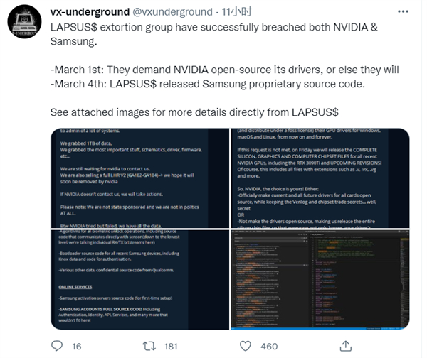 Lapsus$表示,他们在正式攻击英伟达之前已经在内部系统潜伏了一周之久,也已经获取了1TB的机密数据,包括未发布的40系列显卡的设计蓝图、驱动、固件、各类机密文档和SDK开发包等等,并对所有数据进行了备份。