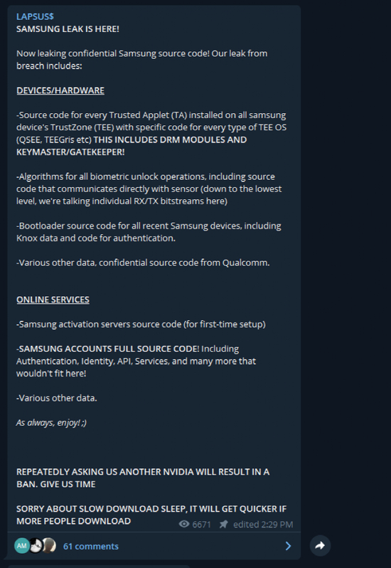 在这家韩国电子巨头发表声明之前,黑客组织Lapsus$周末就已在网络上声称窃取了高达190GB的机密三星源代码。据称,该批资料被拆分为三个压缩文件,通过点对点网络供外界下载。不过,截至目前,该黑客组织并未索要赎金。