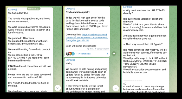 目前,该黑客组织表示,其将以100万美元的价格出售部分数据信息。此外,Lapsus$还泄露了英伟达71335名员工的电子邮箱和密码哈希值。据网站HIBP表示,其中不少内容已经被破解并在黑客社区内大肆传播。此外,Lapsus$还要求英伟达公开其Windows、macOS和Linux设备的GPU驱动程序,将其永久开源。