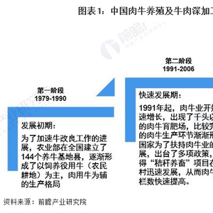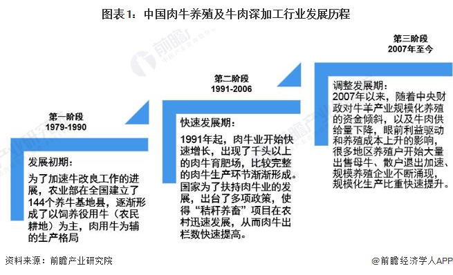 从发展情况来看,我国肉牛养殖及牛肉深加工行业受技术水平限制起步较晚,总体来看,中国的肉牛养殖及牛肉深加工业大概经历了三个发展阶段。